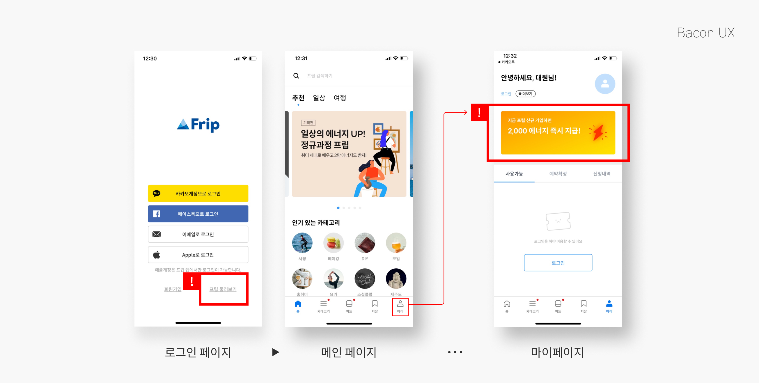 뿐만 아니라 대다수의 사용자는 구글 마켓 & 앱스토어에서 프립의 서비스를 미리 보고, 기대를 품고 다운받기 때문에 미리 프립을 둘러볼 수 있는 과감한 선택을 한다면 회원가입률이 높아질 것으로 생각한다.