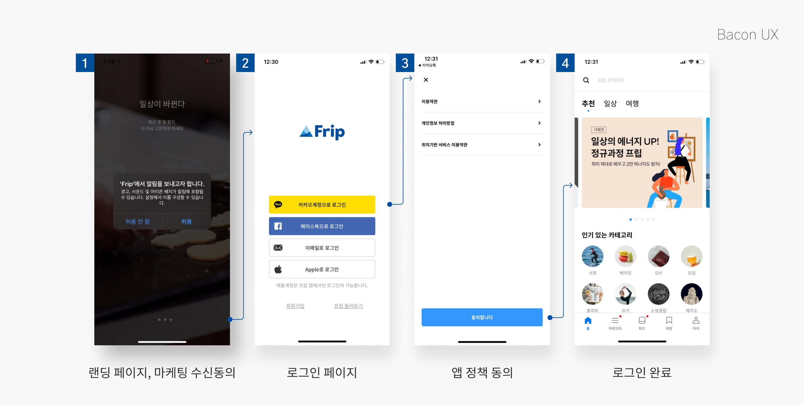 프립의 회원가입 프로세스는 굉장히 간단하다. 군더더기 없는 UI와 소셜 계정 가입 버튼의 위치 또한 '카카오 계정 로그인'의 높은 회원가입률 데이터를 근거로 설계되었다. 하지만 시작하자마자 나타나는 '푸시 알림 여부'를 반갑게 맞이하는 사용자는 안타깝게도 아주 희박하다.
