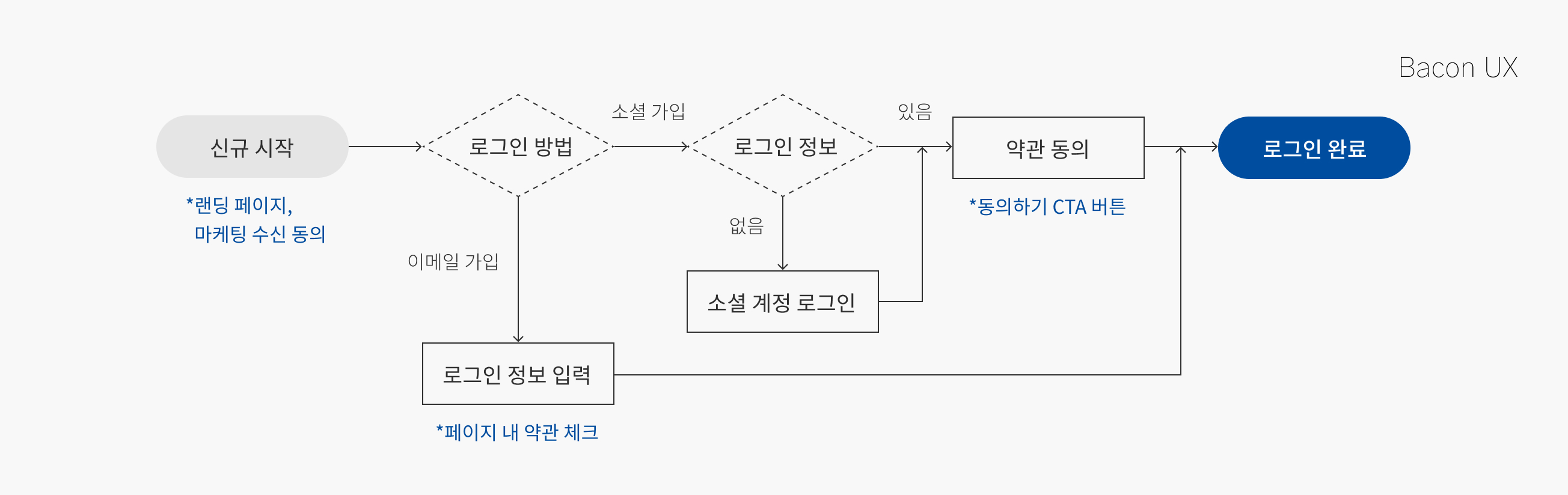 * 소셜 회원가입의 프로세스이며 이메일 회원가입의 경우 기존과 동일한 이메일, 패스워드 입력 페이지가 포함됨.