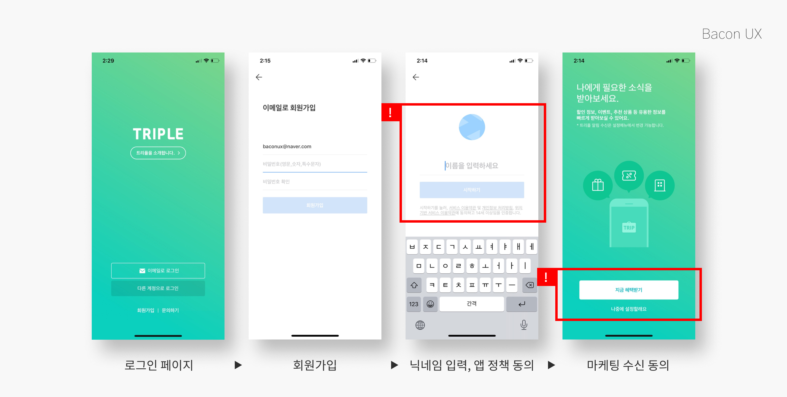 정성적인 여행정보를 제공하는 트리플은 화면마다 닉네임 입력을 유도하며 앱 정책 동의를 포함시켰다. 그리고 마케팅 수신 동의를 얻기 위해 사용자가 얻을 수 있는 정보를 친절하게 설명해준다.
