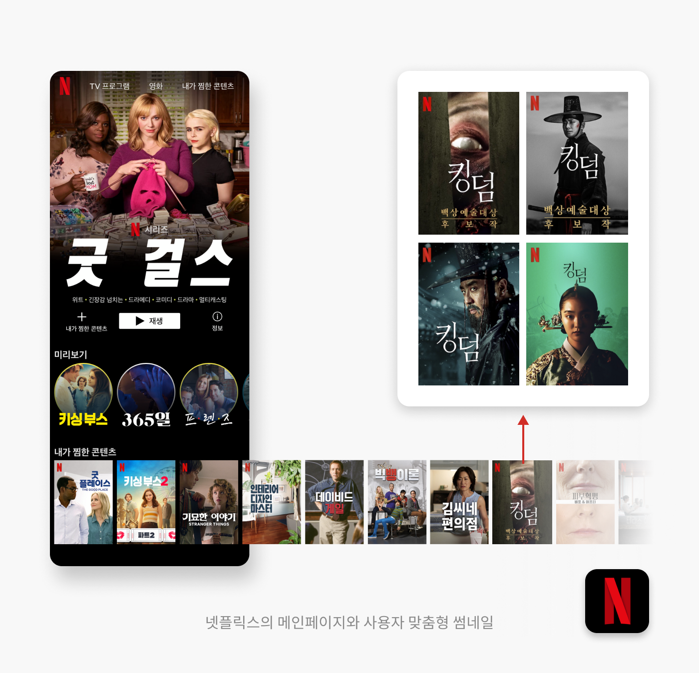 반면 넷플릭스의 경우 왓챠와 다르게 모든 콘텐츠의 제목이 포스터 형식으로 썸네일 안에 노출되고 세로 비율로 좌우 스크롤이 가능한 구조입니다. 여기서 넷플릭스 썸네일이 사용자에게 놀라운 경험을 제공하는데 국가와 문화권 그리고 사용자의 취향을 고려합니다. 가령 '로맨틱' 취향이 강한 사용자에게는 주인공들이 키스하는 장면을 메인 이미지를 보여주듯이 말이죠. 이를 위해 사용자 분석 알고리즘이 테크팀을 전담으로 꾸릴 정도로 더욱 풍부하고, 각 콘텐츠를 해당 알고리즘에 맞게 대응할 포스터를 새로 만들고 있습니다.