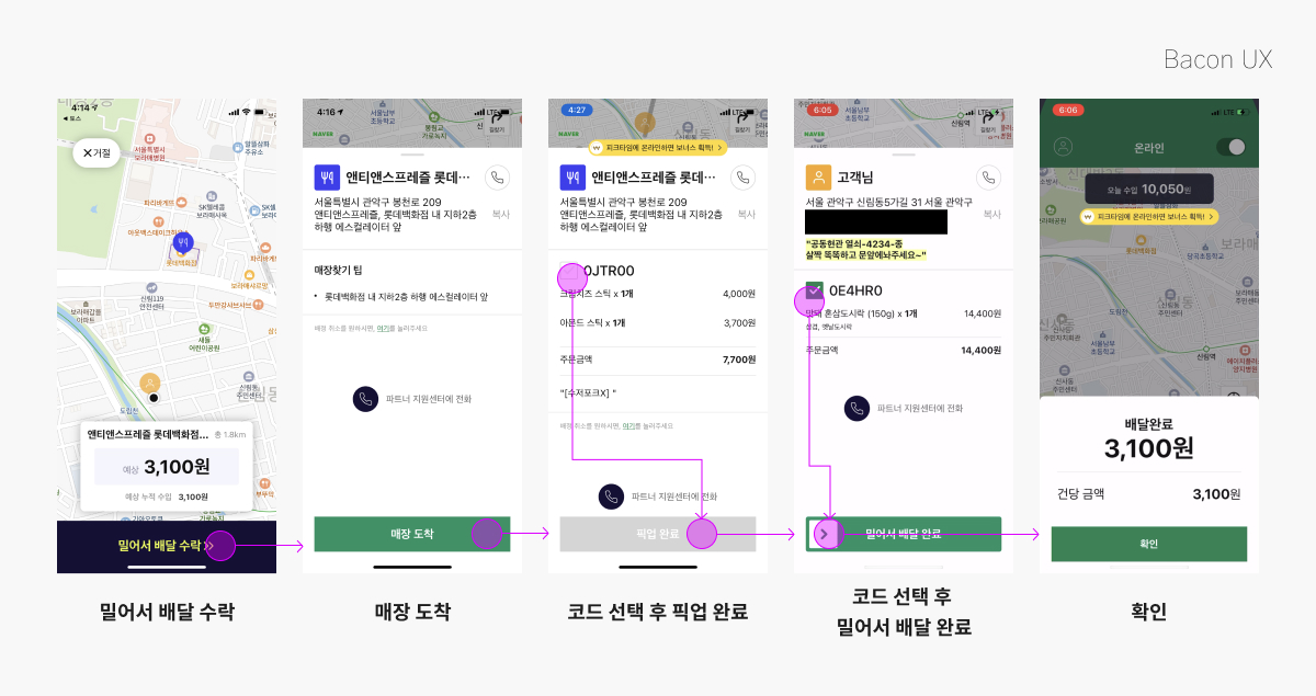 하나의 배달을 수행하기 위해 총 4개의 버튼을 선택하게 되는데 배민 라이더스의 선택 방식과 다르게 쿠팡 이츠는 버튼을 누르고 슬라이드를 해야 해당 수행을 완수할 수 있다. 아이폰의 '밀어서 잠금 해제'처럼 버튼을 실수로 눌렀을 때를 방지하고 슬라이드라는 확실한 행동에 메시지를 추가한 것이 인상적이었다. 실제로 운행 도중 실수로 배달 완료 버튼을 누른 적이 있었는데 그 때는 정말 50m 전력질주하듯이 뛰어가 진땀을 뺀 적이 있었다. (그래서 배달 평점에 불만족 평가가를 받았나 보다)