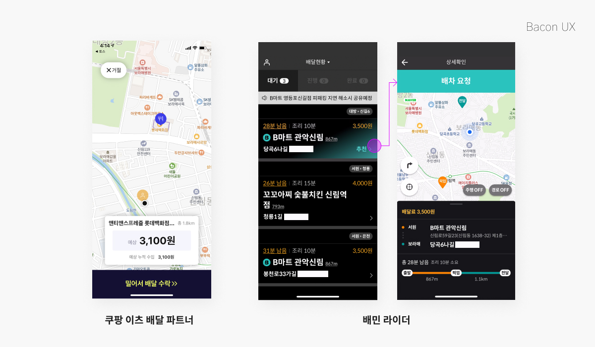 배민과 쿠팡이츠에서 음식을 주문하던 소비자들은 돈을 벌기 위해 주문 접수 앱과 라이더 앱을 이용하는 사용자가 될 수 있다. 배민과 쿠팡 이츠는 말 그대로 모두가 고객이며 모두에게 만족을 줄 수 있도록 계속해서 개선하는 과제가 주어진 것이다. 배달 기사 오픈 채팅 방에서 대화를 나누다 보면 대부분 조금이라도 더 돈을 벌 수 있는 서비스를 사용하곤 한다. 하지만 서비스의 사용성에 대한 불만이 존재하고, 돈보다는 운동삼아 시간을 쓰는 필자의 경우 사용성이 좋은 하나의 서비스만 이용하게 됐다. 다음은 두 서비스를 사용해본 후기이며 칭찬과 아쉬움이 난무하는 주관적인 의견이다.